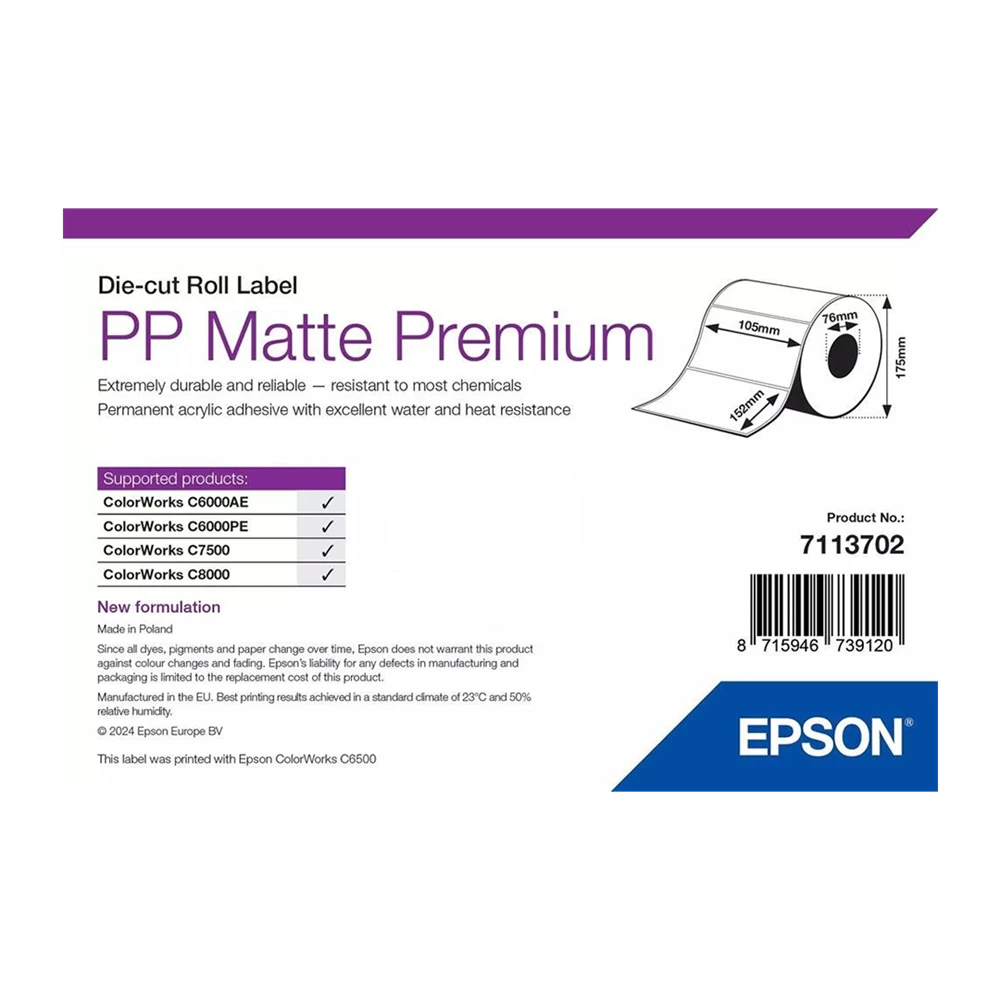 Az Epson műanyag (PP), matt bevonatú, öntapadós etikett címkékhez a gyártó kiváló tapadású, UV stabil, általános acryl ragasztót párosított, ami alkalmassá teszi beltéri és kültéri felhasználásra -20 és 80 C°-os hőmérsékleti tartományban (felragasztási min. hőmérséklet 5 C°). Az InkJet (tintasugaras) matt műanyag etikett címkére készített tintasugaras nyomat ellenáll a nedvességnek, az alkoholnak, az acetonnak, az olajnak, hőnek és számos vegyszernek. A BS 5609 Section 3 tanúsítvány igazolja, hogy a teljes címkézési rendszer a szabvány szerinti legszigorúbb tengervizes és mechanikai vizsgálatoknak is megfelel, és a feliratozás hosszú távon olvasható marad, így kifejezetten GHS címkék vagy egészségügyi/laboratóriumi felhasználásra ajánljuk.