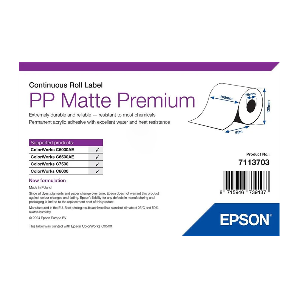 Az Epson műanyag (PP), matt bevonatú, öntapadós etikett címkékhez a gyártó kiváló tapadású, UV stabil, általános acryl ragasztót párosított, ami alkalmassá teszi beltéri és kültéri felhasználásra -20 és 80 C°-os hőmérsékleti tartományban (felragasztási min. hőmérséklet 5 C°). Az InkJet (tintasugaras) matt műanyag etikett címkére készített tintasugaras nyomat ellenáll a nedvességnek, az alkoholnak, az acetonnak, az olajnak, hőnek és számos vegyszernek. A BS 5609 Section 3 tanúsítvány igazolja, hogy a teljes címkézési rendszer a szabvány szerinti legszigorúbb tengervizes és mechanikai vizsgálatoknak is megfelel, és a feliratozás hosszú távon olvasható marad, így kifejezetten GHS címkék vagy egészségügyi/laboratóriumi felhasználásra ajánljuk.