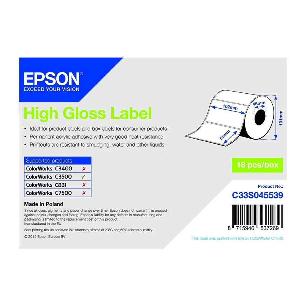 Fényes bevonatú, papír szalagok használata esetén a felhasználó választhatja meg, hogy milyen szélességű öntapadós alapanyagra van szüksége. Az InkJet (tintasugaras) öntapadós szalaghoz az Epson kiváló tapadású, UV stabil, általános acryl ragasztót párosított, ami alkalmassá teszi a címkét beltéri és kültéri felhasználásra -20 és 80 C°-os hőmérsékleti tartományban (felragasztási min. hőmérséklet 5 C°). A fényes papír alapanyagnak és a DURABrite Ultra pigment tintának köszönhetően, élénk színű kiváló minőségű nyomat készül, mely azonnal szárad nagy sebességű nyomtatás esetén is és ellenáll a nedvességnek és hőnek. Ajánljuk termék csomagolásához, ár és vonalkód etikettekhez, valamint csomag/doboz és EU energetikai címkézéshez.