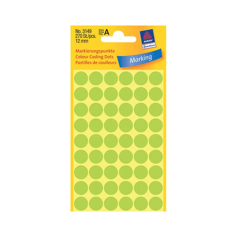 Az Avery Zweckform 12mm átmérőjű, Neon Zöld színű jelölőcímkéi általános célú papír alapanyagból, Normál ragasztóval készülnek. Tökéletes megoldást jelentenek azonosításhoz, jelöléshez (ESD jelölő) raktározásnál és gyártásnál. A jelölőcímkék nem nyomtathatóak és nem fénymásolhatóak, kizárólag kézzel írhatóak és helyezhetőek fel. Egy csomagban 270 öntapadó címke található.