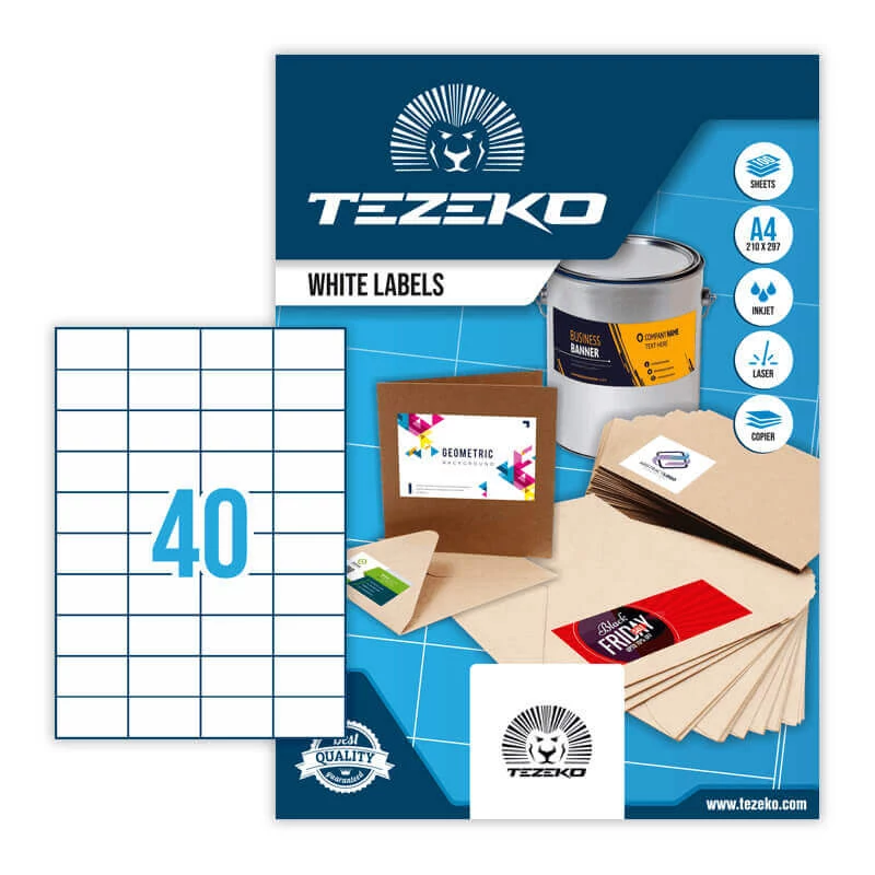A Tezeko által használt minőségi öntapadó alapanyagnak köszönhetően prémium minőségű, határozott nyomatképet biztosít. A TZ-A4-0033 cikkszámú Tezeko etikett címke 100%-ban kompatibilis az általános otthoni és irodai nyomtatókkal (HP, Epson, Canon, Brother, Samsung, Kyocera, Lexmark, OKI). A gyártó közel 100 féle méretű etikett címkét kínál íves portfoliójában mely az általános címkézési igényeket teljes mértékben kielégíti, ugyanakkor a felhasználásuk és nyomtatásuk egyáltalán nem igényel semmilyen speciális tudást.