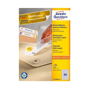 Avery Zweckform 35.6*16.9 mm-es, Papír alapanyagú öntapadós íves etikett címke, Visszaszedhető ragasztóval. Címke alakja: Négyzetes forma, Címke színe: Fehér, egy ív 80 címkét tartalmaz, egy doboz tartalma 8000 etikett címke. Címke működési hőmérséklete: -20 C° - +80 C° között, Címke felragasztási hőmérséklete: 5 C° |