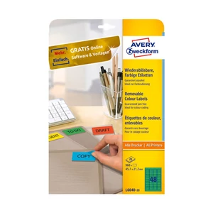Avery Zweckform 45.7*21.2 mm-es, Papír alapanyagú öntapadós íves etikett címke, Visszaszedhető ragasztóval. Címke alakja: Négyzetes forma, Címke színe: Zöld, egy ív 48 címkét tartalmaz, egy doboz tartalma 960 etikett címke. Címke működési hőmérséklete: -20 C° - +80 C° között, Címke felragasztási hőmérséklete: 5 C° |