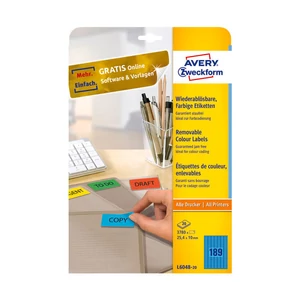 Avery Zweckform 25.4*10 mm-es, Papír alapanyagú öntapadós íves etikett címke, Visszaszedhető ragasztóval. Címke alakja: Négyzetes forma, Címke színe: Kék, egy ív 189 címkét tartalmaz, egy doboz tartalma 3780 etikett címke. Címke működési hőmérséklete: -20 C° - +80 C° között, Címke felragasztási hőmérséklete: 5 C° |
