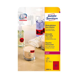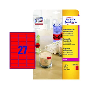 Avery Zweckform 63.5*29.6 mm-es, Papír alapanyagú öntapadós íves etikett címke, Visszaszedhető ragasztóval. Címke alakja: Négyzetes forma, Címke színe: Neon Piros, egy ív 27 címkét tartalmaz, egy doboz tartalma 675 etikett címke. Címke működési hőmérséklete: -20 C° - +80 C° között, Címke felragasztási hőmérséklete: 5 C° |