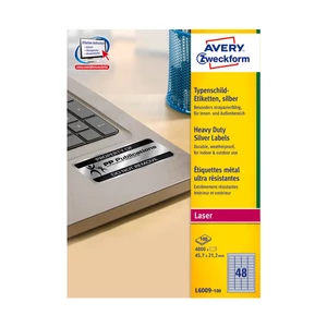 Avery Zweckform 45.7*21.2 mm-es, Műanyag PET alapanyagú öntapadós íves etikett címke, Erős ragasztóval. Címke alakja: Négyzetes forma, Címke színe: Ezüst, egy ív 48 címkét tartalmaz, egy doboz tartalma 4800 etikett címke. Címke működési hőmérséklete: -40 C° - +150 C° között, Címke felragasztási hőmérséklete: 5 C°  |