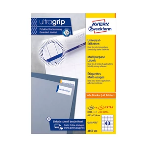 Avery Zweckform 48.5*25.4 mm-es, Papír alapanyagú öntapadós íves etikett címke, Normál ragasztóval. Címke alakja: Négyzetes forma, Címke színe: Fehér, egy ív 40 címkét tartalmaz, egy doboz tartalma 8000 etikett címke. Címke működési hőmérséklete: -20 C° - +80 C° között, Címke felragasztási hőmérséklete: 5 C° |