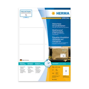 Herma 99.1*67.7 mm-es, Műanyag PET alapanyagú öntapadós íves etikett címke, Erős ragasztóval. Címke alakja: Négyzetes forma, Címke színe: Fehér, egy ív 8 címkét tartalmaz, egy doboz tartalma 200 etikett címke. Címke működési hőmérséklete: -40 C° - +150 C° között, Címke felragasztási hőmérséklete: 5 C° |