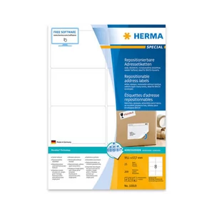 Herma 99.1*67.7 mm-es, Papír alapanyagú öntapadós íves etikett címke, Visszaszedhető ragasztóval. Címke alakja: Négyzetes forma, Címke színe: Fehér, egy ív 8 címkét tartalmaz, egy doboz tartalma 200 etikett címke. Címke működési hőmérséklete: -20 C° - +80 C° között, Címke felragasztási hőmérséklete: 5 C° |