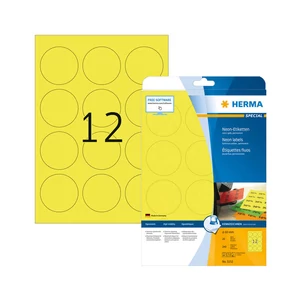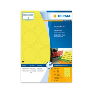 Herma 60*60 mm-es, Papír alapanyagú öntapadós íves etikett címke, Normál ragasztóval. Címke alakja: Kör, Címke színe: Neon Sárga, egy ív 12 címkét tartalmaz, egy doboz tartalma 240 etikett címke. Címke működési hőmérséklete: -20 C° - +80 C° között, Címke felragasztási hőmérséklete: 5 C° |
