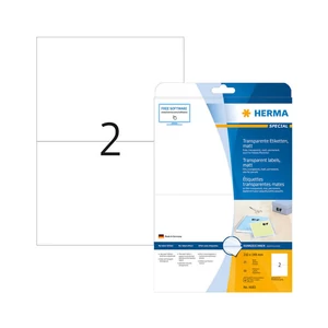 Herma 210*148 mm-es, Műanyag PE alapanyagú öntapadós íves etikett címke, Normál ragasztóval. Címke alakja: Négyzetes forma, Címke színe: Átlátszó (víztiszta), egy ív 2 címkét tartalmaz, egy doboz tartalma 50 etikett címke. Címke működési hőmérséklete: -20 C° - +80 C° között, Címke felragasztási hőmérséklete: 5 C° |