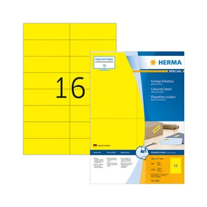 Herma 105*37 mm-es, Papír alapanyagú öntapadós íves etikett címke, Normál ragasztóval. Címke alakja: Négyzetes forma, Címke színe: Sárga, egy ív 16 címkét tartalmaz, egy doboz tartalma 1600 etikett címke. Címke működési hőmérséklete: -20 C° - +80 C° között, Címke felragasztási hőmérséklete: 5 C° |