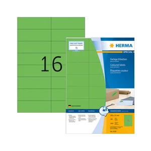 Herma 105*37 mm-es, Papír alapanyagú öntapadós íves etikett címke, Normál ragasztóval. Címke alakja: Négyzetes forma, Címke színe: Zöld, egy ív 16 címkét tartalmaz, egy doboz tartalma 1600 etikett címke. Címke működési hőmérséklete: -20 C° - +80 C° között, Címke felragasztási hőmérséklete: 5 C° |