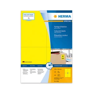 Herma 105*148 mm-es, Papír alapanyagú öntapadós íves etikett címke, Normál ragasztóval. Címke alakja: Négyzetes forma, Címke színe: Sárga, egy ív 4 címkét tartalmaz, egy doboz tartalma 400 etikett címke. Címke működési hőmérséklete: -20 C° - +80 C° között, Címke felragasztási hőmérséklete: 5 C° |