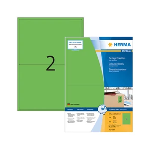 Herma 199.6*143.5 mm-es, Papír alapanyagú öntapadós íves etikett címke, Normál ragasztóval. Címke alakja: Négyzetes forma, Címke színe: Zöld, egy ív 2 címkét tartalmaz, egy doboz tartalma 200 etikett címke. Címke működési hőmérséklete: -20 C° - +80 C° között, Címke felragasztási hőmérséklete: 5 C° |
