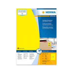 Herma 210*297 mm-es, Papír alapanyagú öntapadós íves etikett címke, Visszaszedhető ragasztóval. Címke alakja: Négyzetes forma, Címke színe: Sárga, egy ív 1 címkét tartalmaz, egy doboz tartalma 20 etikett címke. Címke működési hőmérséklete: -20 C° - +80 C° között, Címke felragasztási hőmérséklete: 5 C° |